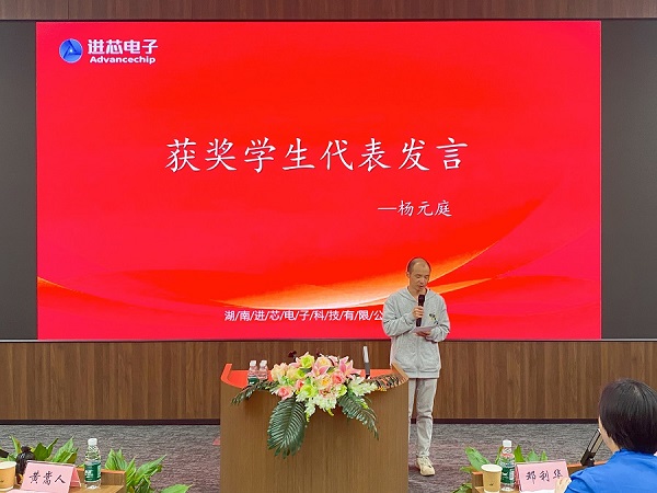 “进芯电子奖学金”获奖学生代表发言,他感谢进芯电子对青年学子的支持,感谢学校对自身的培养,表示深耕专业知识、厚植家国情怀是成才的必经之路,他将再接再厉,勇创佳绩。