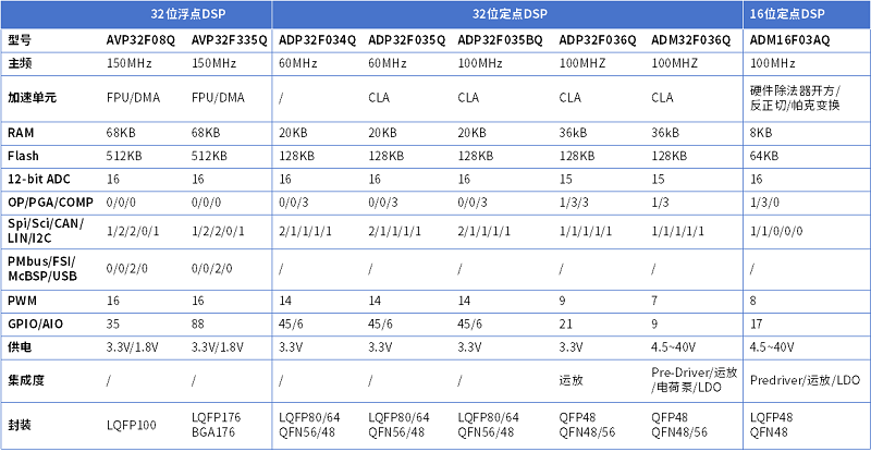 针对以上需求,进芯电子经过多年深耕,推出了符合IATF16949,AEC-Q100 Grade1标准的强大产品阵容,包括:32位浮点高性能DSP芯片AVP32F335系列,32位定点实时控制DSP芯片ADP32F034、ADP32F035系列,32位定点车身控制DSP芯片ADP32F036、ADM32F036系列, 16位定点高性价比DSP芯片ADM16F03系列;匹配电动汽车从动力域到车身域的多种应用。进芯产品凭借其优异性能获得OEM厂商的认可,已实现商用量产,并提供长期供货保证。
