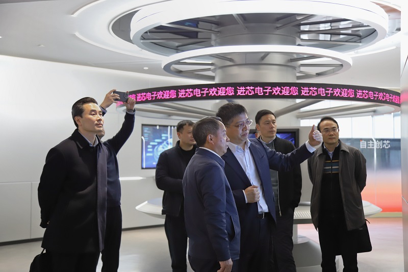 2024年2月21日,湖南大学校长段献忠一行莅临进芯电子指导交流,进芯电子董事长黄嵩人、副总经理易峰参与接待,陪同调研并座谈。
