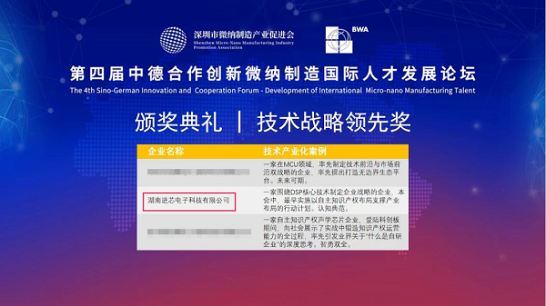 1月6日,由深圳市微纳制造产业促进会、德国联邦经济发展和对外贸易联合总会(BWA)联合主办,西丽湖人才服务中心承办的“第四届中德合作创新微纳制造国际人才发展论坛”于深圳顺利举行,论坛围绕微纳制造技术产业化、国际合作、科创人才发展等话题进行了演讲和探讨。在“微纳制造技术产业化优秀案例评选”中,进芯电子荣获“技术战略领先奖”。