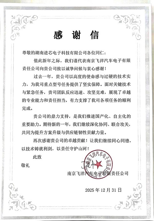 岁末序章,暖意盈怀。在2025年收官之时,湖南进芯电子科技有限公司陆续收到了来自汽车电子、电源、工业等多个领域客户的感谢信。每一封感谢信,不仅是客户对我们工作的肯定,更是对进芯电子技术实力、响应速度与服务精神的深度认同。这些跨越不同行业的认可,是对我们2025年专业能力与协同价值的集中体现,也为2026年我们持续深耕国产芯片自主化之路注入了坚定动力。