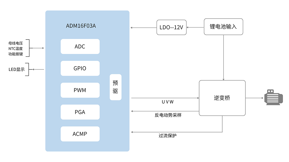 ●多种保护措施:过流保护、短路保护、过压保护、欠压保护、堵转保护、电池过温保护、MOS管过温保护等