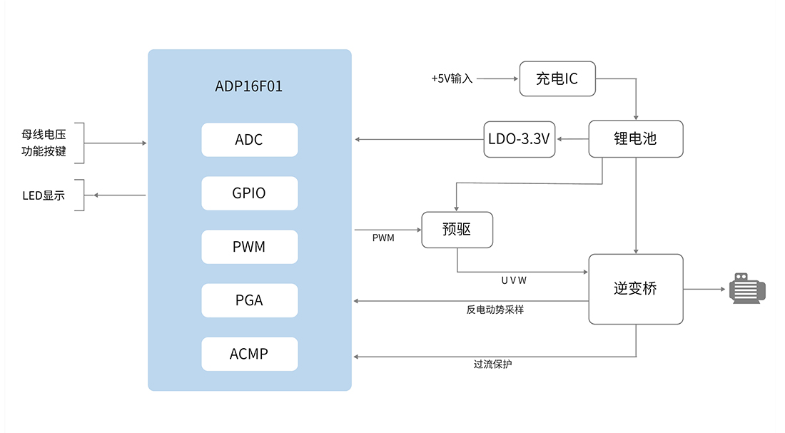 本方案是基于进芯16位DSPADP16F01开发的,充分发挥了ADP16F01的算力、资源、成本等优势。整个系统结构简单,采用无感方波控制算法,能够实现筋膜枪的稳定启动和运行,通过设置不同的限流点可以实现对的力道大小的调节;拥有堵转卸力,快速充电,动力强劲等功能。