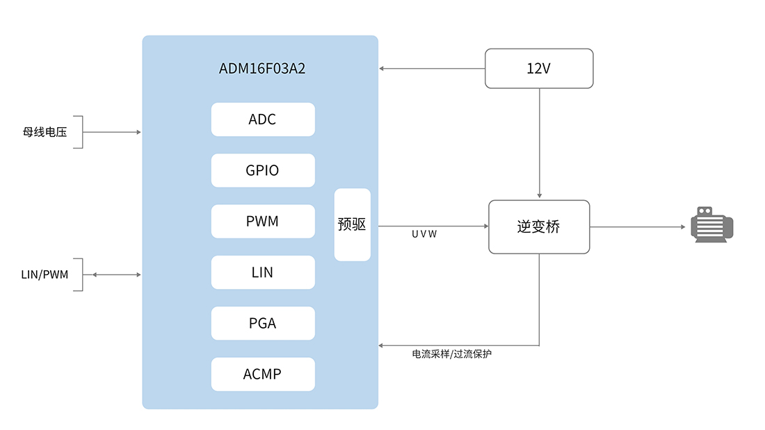 该方案采用单电阻FOC算法,电路简单,成本低;通过自研无感FOC算法,功率闭环、速度闭环,具备电机控制平稳,运行噪音小、强带载启动能力等优势
