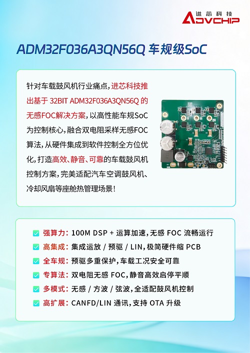 直面行业核心痛点,进芯科技ADM32F036A3QN56Q车规级SoC无感FOC解决方案重磅登场,以硬核性能精准破局: